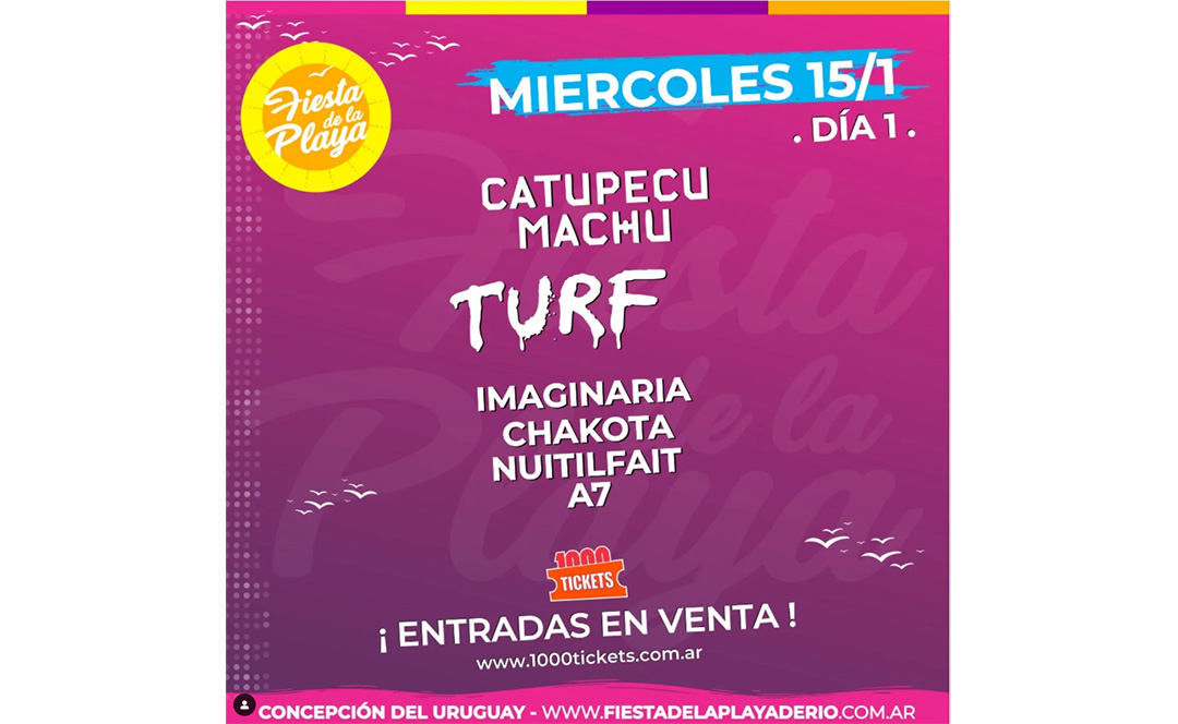 Turf llegará a la Fiesta de la Playa en un gran momento, con sus canciones pegadizas que se corean en estadios de fútbol y suenan en todas las radios. La banda de Joaquín Levinton ya fue parte de esta Fiesta en otros tiempos, y ahora tendrá a su cargo abrir el escenario principal que cuenta con tecnología de última generación en pantallas e iluminación, lo que promete una gran noche. «Cuatro personalidades», «Loco un poco» y «Pasos al costado» serán apenas de algunas de las canciones que promete cantar el público que hoy podrá disfrutar de esta noche de la Fiesta de la Playa.