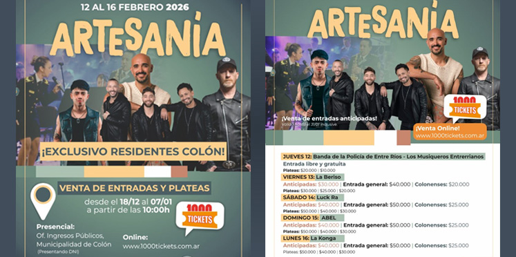 A partir de este jueves 18 de diciembre a las 10, se ponen a la venta plateas exclusivamente para colonenses para la 41° Fiesta Nacional de la Artesanía de Colón y entradas generales presenciales con el DNI u OnLine a través de la Web www.1000tickets.com.ar