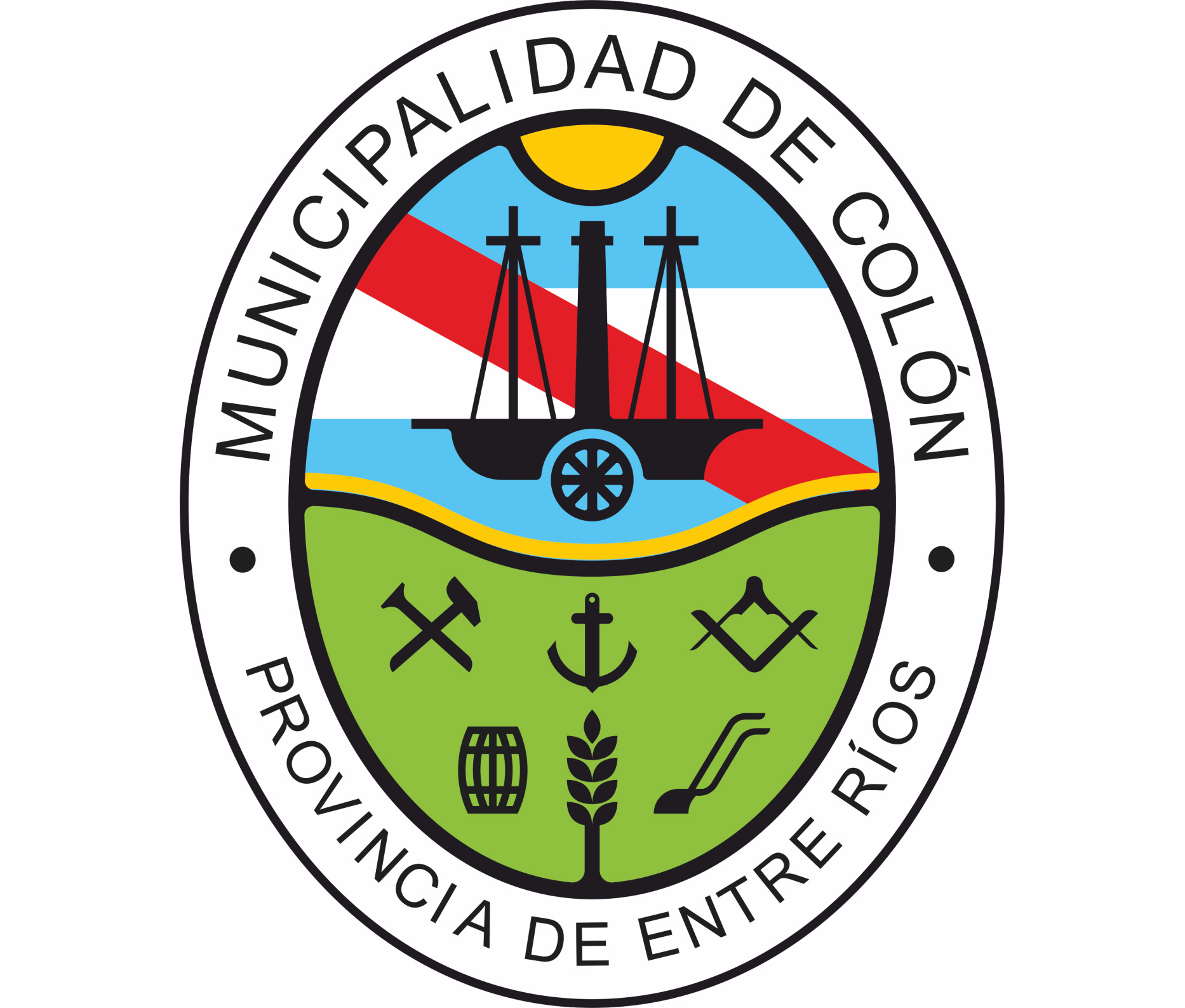 DESCRIPCION: El diseño del escudo municipal se realizó partiendo de las figuras que aparecen el sello original de la Municipalidad de Colón recuperado a través de una investigación del mismo. “Los elementos gráficos respetan el sello original, en su simbolismo y su significado. Sin embargo, han sido rediseñados y adaptados a una estética contemporánea. Hacemos uso de estos símbolos en homenaje y reconocimiento al momento histórico en que fueron creados, pero con una impronta actual que conserva la esencia tradicional y clásica de los escudos. El diseño, aunque sencillo, no busca ser moderno ni pretender una imitación de lo antiguo; en cambio, propone un equilibrio entre tradición y actualidad, garantizando su vigencia en el tiempo. Imitar lo antiguo haría que el diseño se volviera rápidamente obsoleto, mientras que este enfoque asegura una relevancia duradera y visualmente ordenada, pensado para hoy y para el futuro.” Se realizó una adaptación tomando como parámetros elementos de la heráldica civil. Las figuras fueron redibujadas con un estilo más estilizado. Se optó por un campo oval más propio de un organismo público tomando como parámetros el escudo provincial y el nacional. El campo oval tiene una bordadura que lleva una inscripción en orla superior e inferior, separadas ambas partes del texto (“Municipalidad de Colón” y “Provincia de Entre Ríos” por sendos discos pequeños, sobre campo plata (blanco). Las inscripciones (en tipografía bookman) como los pequeños discos son de color sable (negro). Se eligió esta tipografía porque fue creada en 1860 y coincide con la década de la fundación de la ciudad, lo que aporta un vínculo histórico y cultural al diseño. El campo está cortado por dos líneas ondulantes horizontales: oro (amarillo) arriba y sable (negro) abajo. En el cuartel superior, la figura central color sable (negro) es una nave (barco a vapor con una chimenea central, dos mástiles y una rueda central, navegando hacia diestra sobre un río). La figura se halla sobre un campo con los colores de la bandera de Entre Ríos: tres bandas horizontales (celeste-azur, blanco-plata, celeste-azur), atravesadas por una banda roja (gules) que baja de diestra a siniestra. En la parte superior (jefes) de este campo, un semicírculo oro (amarillo) representando al sol. En el cuartel inferior, sinople (verde), se hallan las figuras recuperadas del sello original de la municipalidad, pero estilizadas y de color negro (sable). La original gavilla de trigo aquí está representada por una espiga en posición centro de la punta. Sobre la misma un ancla. En el franco diestro superior de este campo, un martillo y un cincel cruzados, mientras que, en el franco siniestro, aparece una escuadra y compás cruzadas. Dentro de este cuartel inferior, abajo a la diestra se encuentra la figura de un barril y a siniestra un arado de mancera. SIGNIFICADO Y DESCRIPCIÓN: En la bordadura del escudo, las inscripciones identifican a la institución Municipalidad de Colón en el contexto de la Provincia de Entre Ríos. El campo del escudo está dividido en dos cuarteles por dos líneas ondulantes (una negra-sable y la superior amarilla-oro). Esta última representa la arena de la costa del río Uruguay, sobre la cual se levanta la ciudad de Colón. La figura central del cuartel superior es un barco navegando el río Uruguay. Representa por un lado la llegada de los inmigrantes y la identidad de Colón nacida como ciudad puerto. Los barcos a vapor fueron uno de los primeros transportes que sirvieron a la ciudad para abrirse al mundo, permitiendo la llegada y salida de mercaderías. También representa al puerto como elemento simbólico de encuentro entre los colonenses y quienes llegan a conocerla y disfrutarla. La figura de la nave, esta sobre un campo que representa al mismo tiempo la bandera de Argentina y la de Entre Ríos, emblemas de pertenencia y orgullo, uniendo identidad local y nacional. Sin olvidar que la bandera de nuestra provincia fue la que usaba Artigas por lo que también nos recuerda el permanente vínculo con la vecina República Oriental del Uruguay. Los mismos colores de la bandera, simbolizan el cielo y el río Uruguay con su horizonte amplio y los sueños que éste inspira.
