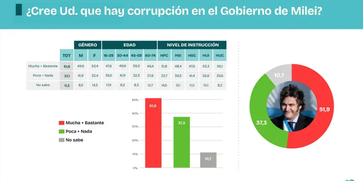 La evaluación general del gobierno de Javier Milei, el 53,7% desaprobó la gestión, mientras que un 32,1% la aprobó. Un 14,2% respondió que «no sabe».
