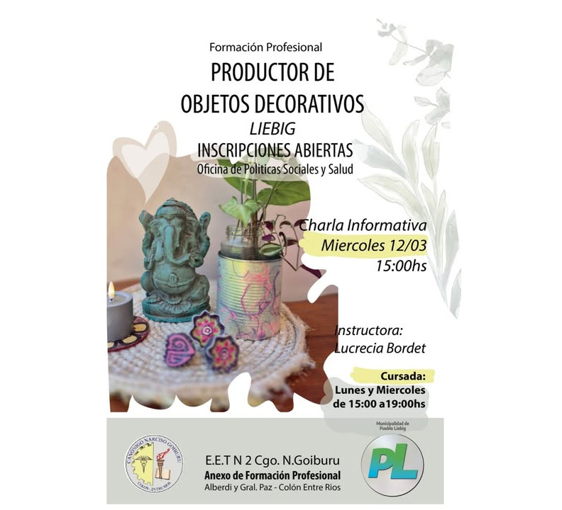 Desde la Municipalidad de Pueblo Liebig informamos que se encuentran abiertas las inscripciones para la Formación Profesional «Productor de Objetos Decorativos» a desarrollarse en Pueblo Liebig.