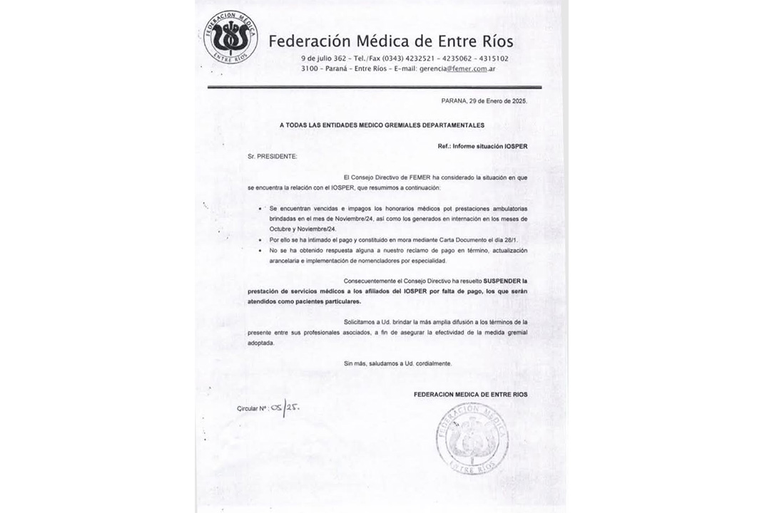 En una nota dirigida a todas las entidades médico gremiales departamentales, el Consejo Directivo de Federación Médica de Entre Ríos (FEMER) informó que «considerando la situación en que se encuentra la relación con la Obra Social provincial» resolvió “suspender la prestación de servicios médicos a los afiliados del IOSPER por falta de pago, los que serán atendidos como pacientes particulares”.