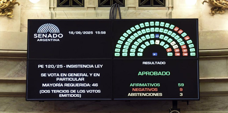 La votación superó con holgura los dos tercios de los presentes que exige la Constitución para insistir en la sanción de una ley. Después de poco más de tres horas de debate, el tablero marcó un abrumador resultado de 59 votos a favor, 9 en contra y tres abstenciones.