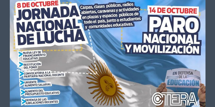 La CTERA lanzó un paro para el próximo martes 14 de octubre. La protesta nacional se hará sentir también en Entre Ríos, ya que AGMER decidió adherir a la medida de fuerza.